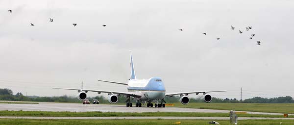 Air Force One arrives at McConnell Air Force Base on Wednesday, May 9, 2007, for President Bush's tour of the Greensburg tornado damage.