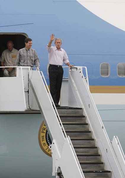 President Bush waves to the media, followed by Sen. Sam Brownback and Pat Roberts, at McConnell Air Force Basde on Wednesday, for a tour of the Greensburg tornado damage.