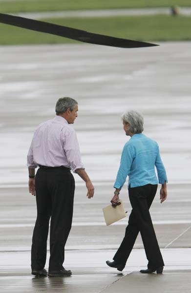 President Bush and Kansas Gov. Kathleen Sebelius make their way to the helicopter at McConnell Air Force Base on Wednesday, May 9, 2007, for President Bush's tour of the Greensburg tornado damage.