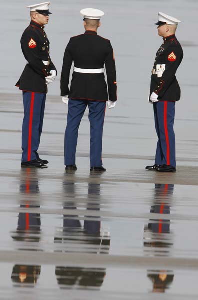 Three Marines wait for Air Force One to land with President Bush at McConnell AFB on Wednesday, May 9, 2007, for President Bush's tour of the Greensburg tornado damage.