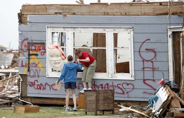 Connor Staats helps her mother, Susan Staats, through a window of their home on Main Street. The pair were at a forensics tournament in Salina when the tornado happened.