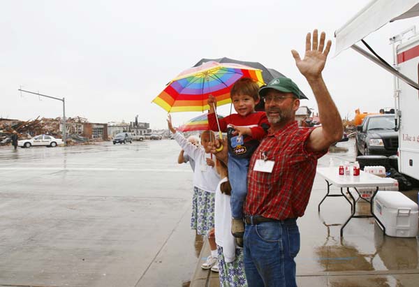 Lee Dirks and his family wave to President Bush's motorcade as it drives west on U.S.54 in Greensburg.